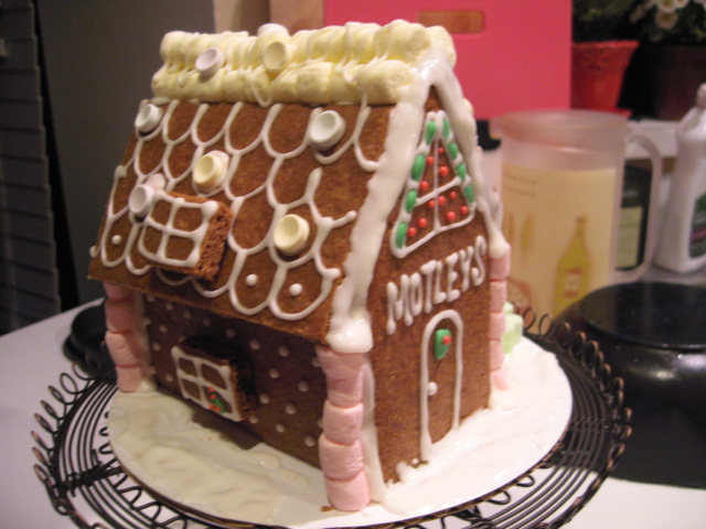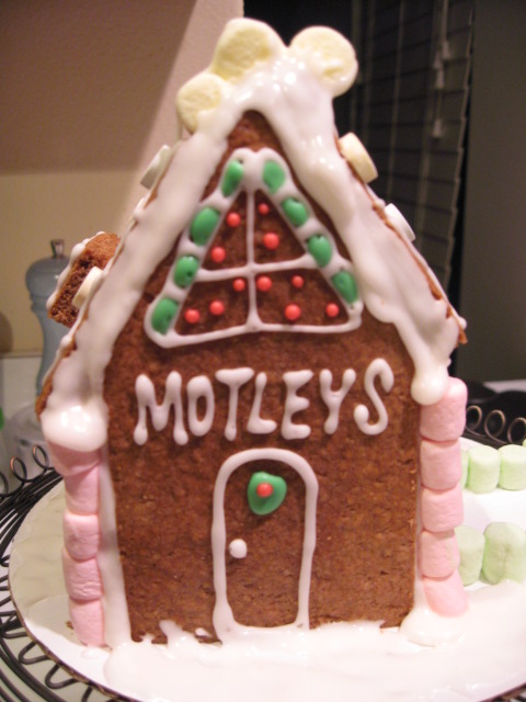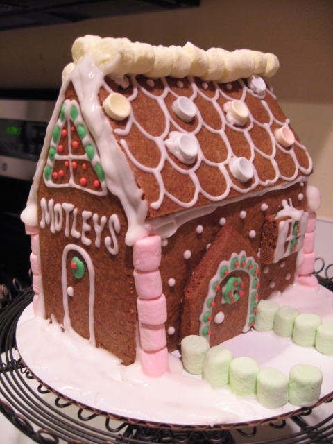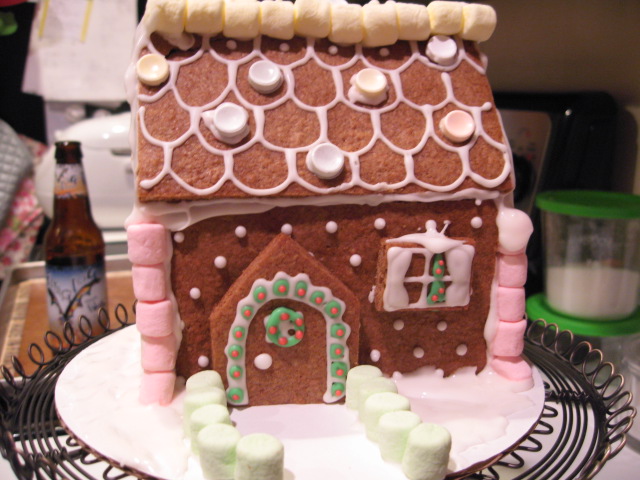 ジンジャーブレッドハウス、できた。最後の方でアイシングがなくなって(泣)、あと少しのためにもう一度作るのがめんどうくさくなって、のばしたりして、ふんばりました。こんな、面倒くさがってるからうまくいかないんだよなあ。