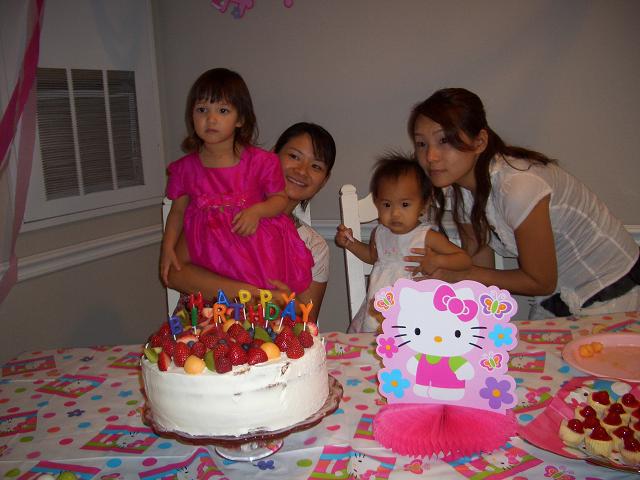 さしゃは2歳に、そしてジャズミンちゃんは1歳になりました! 家のデコレーションもピンクでかためて。たくさんのママ&子が集まった。 子供って成長がとってもはやいよね。一年前はあ~だったのに、今はこんなだみたいな。さしゃはかわいいピンクのドレスを着ていたけど、まだ自分が2歳の誕生日会を開いてもらったってことにあんまりきずいていないみたいだった。もちろんジャズミンちゃんも。そこがまたかわいいんだけどね。 誕生日会ということで私はケーキ作りに携わった。アメリカンなサイズのバカデカイケーキを作って、こんもりとたくさん(ほんとにたくさん)の果物をのっけた。子供がたくさんだから。ケーキを運ぶときにちょっと傾いてケーキの側面の一部がケーキを入れていたタッパーウエアについてしまい、いくつかフルーツも脱落し、ちょっとぶさいくな感じになってしまった(別にななこちゃんを責めてない)けど、みんながおいしいといってくださったのでとりあえず○。 子供ってろうそくの火を消すのが大好きだよね。子供たちはケーキのろうそくが消えたあとも、自分もけすぅ~って泣き出したり。そして、またろうそくつけて、フウッってやらせての繰り返し。それもまた、楽しいんだけどね。 ケーキの後はプレゼントタイム! さしゃもジャズミンもた~くさんもらったね。うれしそうでした☆ ふたりとも、お誕生日おめでと! |