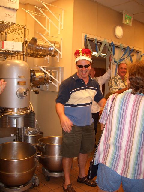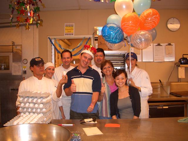 今月の9日、彼は、世界選手権(選手?)に出場してきた。結果は。。。。1位フランス、2位日本で、3位にアメリカだった。彼は、一位を取りたかったのでかなりショックだったそうだけど、3位でも十分だよねー。一年間練習してきたので、かなりこの大会に力を入れてきたか分かります。私は日本が2位だったのにかなりウレシ。彼には内緒だけど。 そして、今日がその後、彼の初出勤の日。たーくさんの人がベーカリーに集まって祝福しました。私も今日は仕事休みだったけど、わざわざ朝の7時半に行ったわ。 クッキーの大好きなデービッドのためにバカでかいチョコレートチップクッキーを焼いて、王冠をのせてみました。クッキーの上には、’You deserve this one!'(このおっきなクッキーを(試合で勝った)あなたなら食べる価値がある!)と書いています。 たくさんの人の集まりようにデービットもびっくりした様子。でも、集まってくれてありがとう。と言ってました。 話は変わりますが、 最近ダンナさんと私は引越しの準備をしています。昨日もパッキングに忙し忙し。そんななか、ダンナはピューとかいって美亜を空中を走らせて遊んでました。かわいそうな美亜。ちゃんとおなか押さえといてよぉ~。最近、彼は美亜のことを‘プーナム’と呼んでいます。なんでだろう。